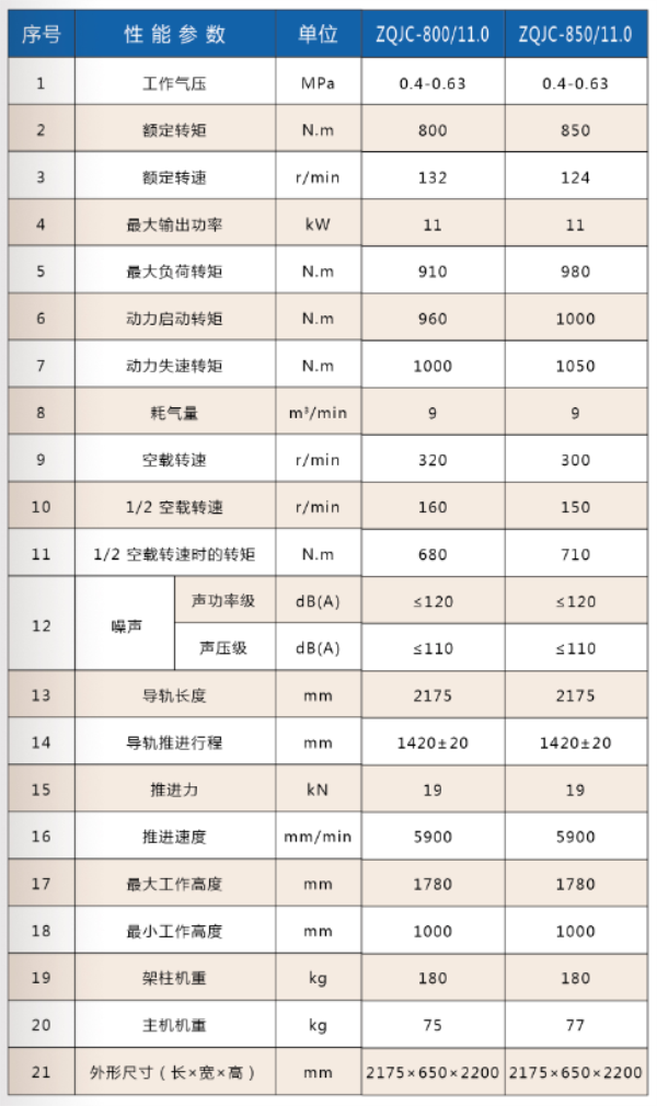 ZQJC800系列氣動架柱式鉆機產品簡介 類別:氣動架柱式鉆機 型號:ZQJC-850/11.0S,ZQJC-800/11.0S, 品牌:河北啟睿 用途:ZQJC-800/11.0S型氣動架柱式鉆機主要用于煤礦煤層探水、探排瓦斯 孔或地質結構孔的施工。該鉆機轉速更高,扭矩更大,功率更強、并可正反轉、 大大提高了人機工作效率,是煤礦行業(yè)常用鉆具之一。